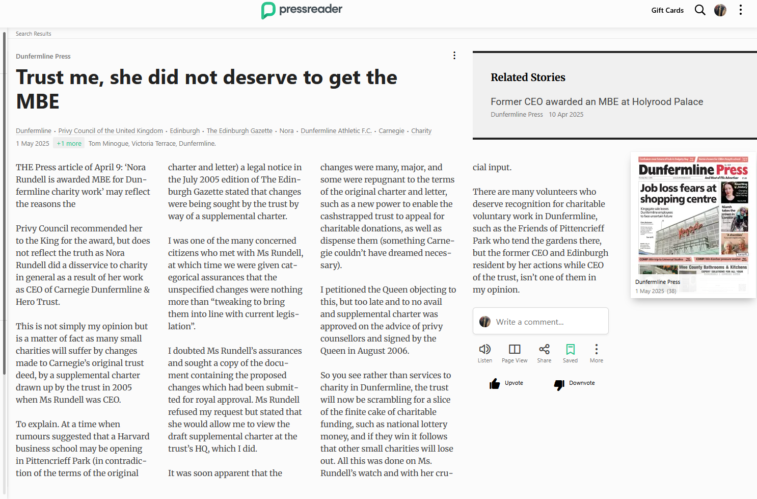 My letter entitled “Trust me, she did not deserve to get the MBE” published in the Dunfermline Press. LINK